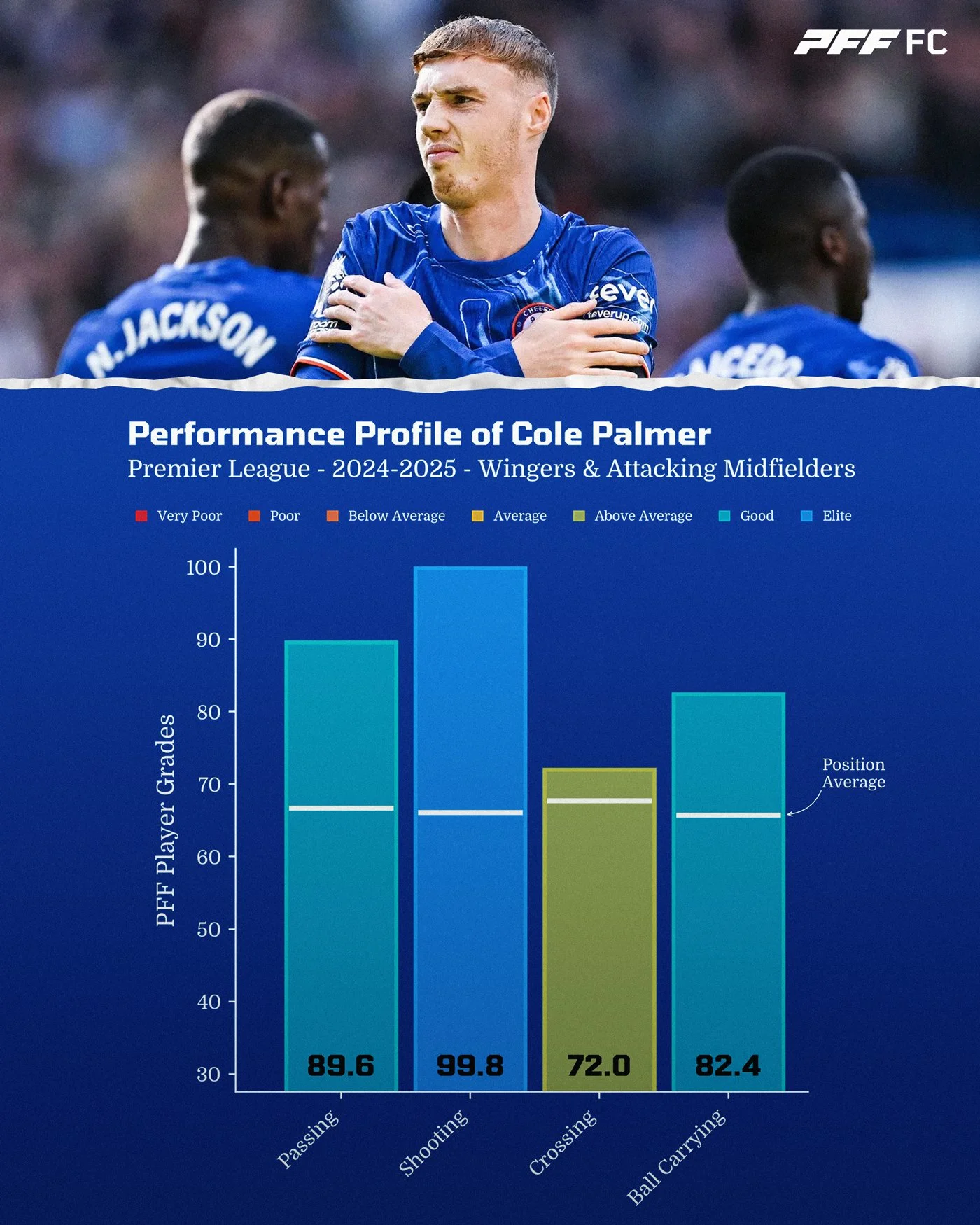 Palmer has some of the best attacking output in the Premier League this season, grading well above his positional average. His 99.8 shooting grade ranks 1st among all players.