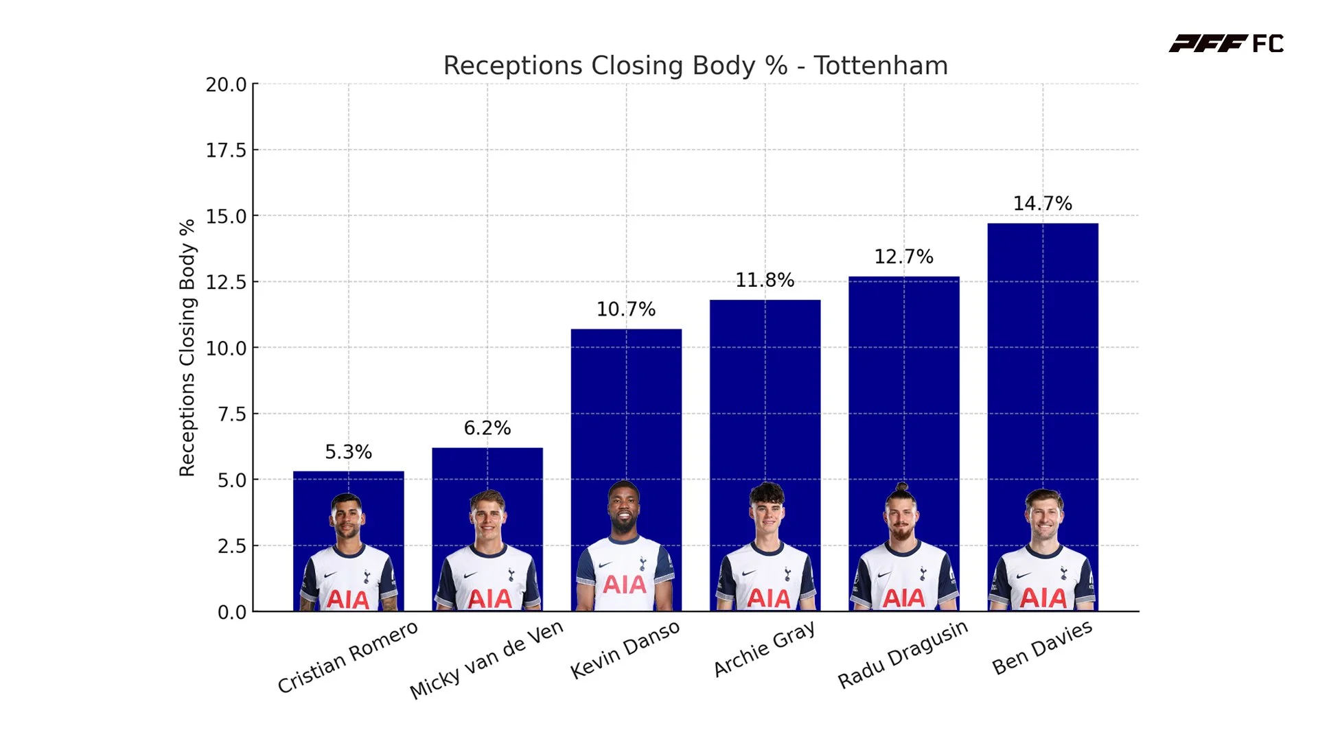 Rankings among CB’s in the Premier League: Romero 1st, Van de Ven 2nd, Danso 26th, Gray 33rd, Dragusin 43rd, Davies 54th. Out of 72 CBs with more than 200 receptions.