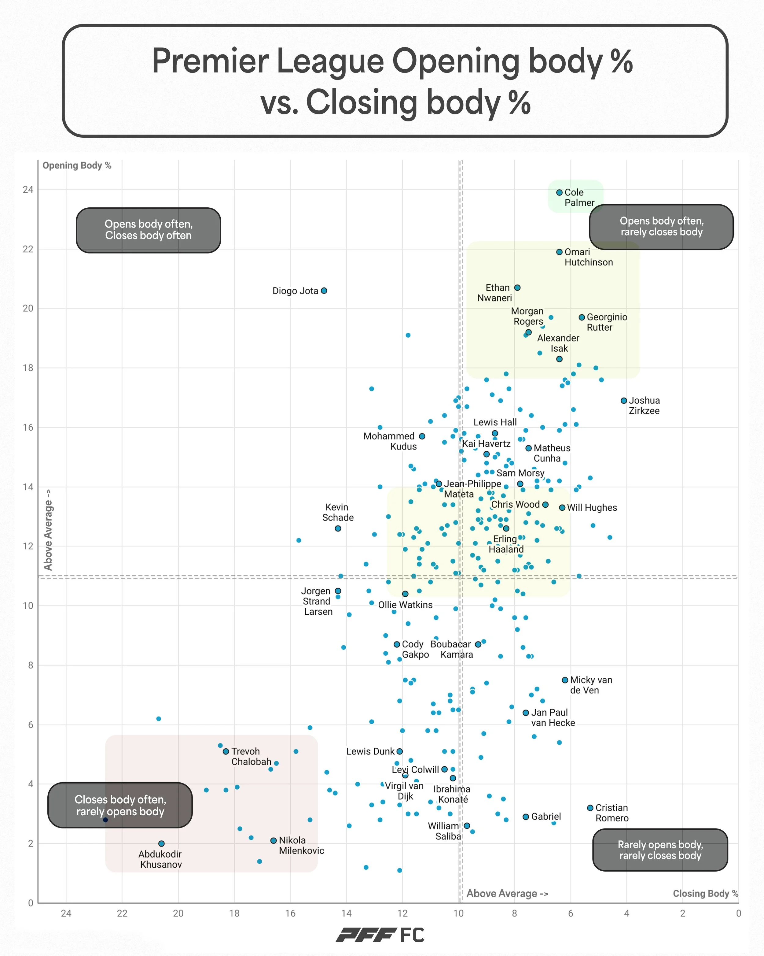 We couldn’t complete this article without digging into Cole Palmers numbers a little, as he is perhaps the biggest outlier of all. As mentioned at the top he leads the league by a substantial margin in both Receptions Opening his Body & Receptions Opening to Goal, but to me the most impressive thing is how often he opens his body compared to how often he closes it. He opens his body 23.9% of the time (the most in the league) compared to closing it just 6.4% of the time. The difference of 17.5 percentage points between those 2 figures is the largest in the league, Omari Hutchinson in 2nd is 2 percentage points lower at 15.5.