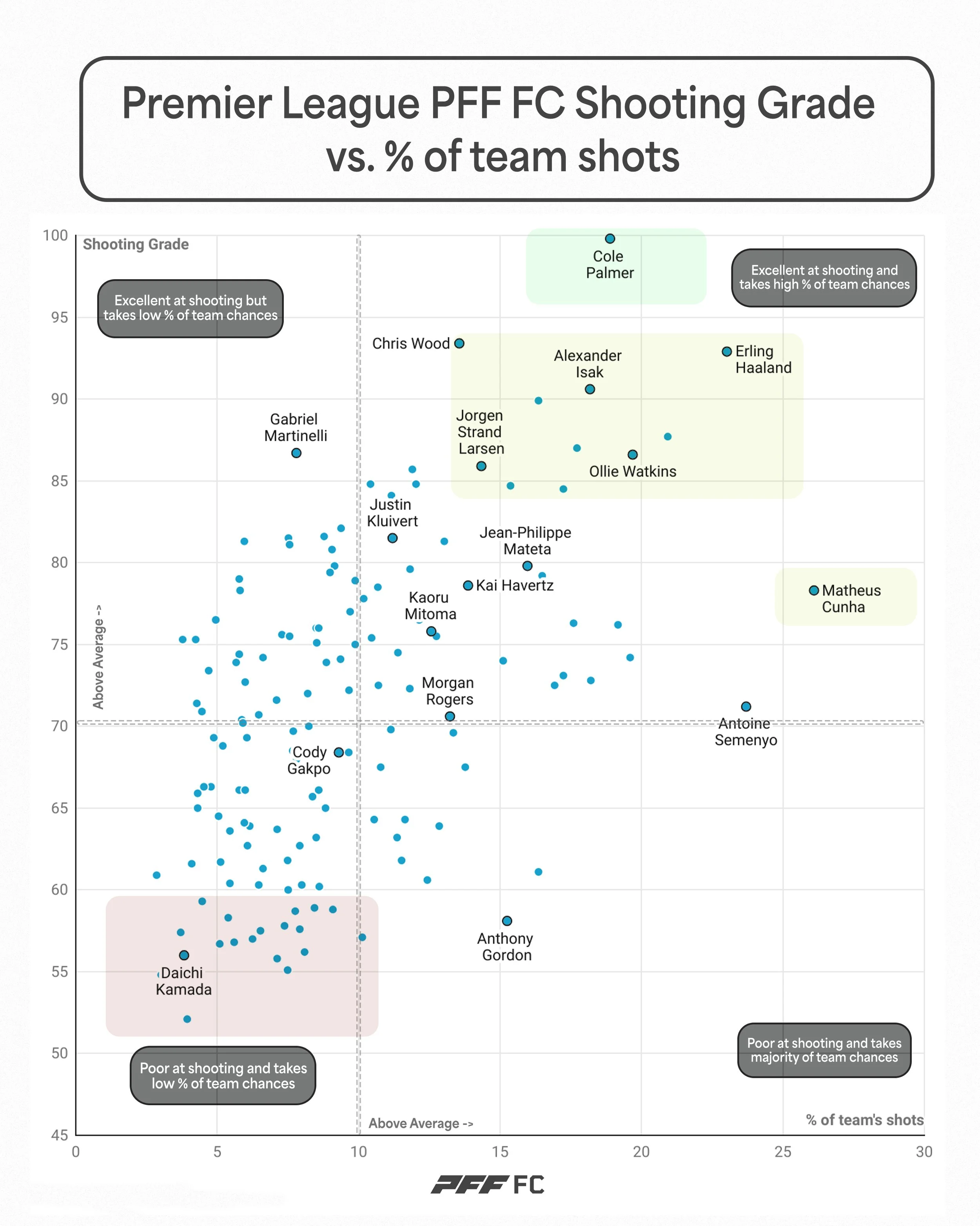 One of the defining qualities of our data at PFF FC is the ability to combine our traditional metrics and the data from our grading process which evaluates every event a player is involved in on the pitch. You can combine that data in various ways to get a more complete picture of a player or team. In this article, I’m going to look at which teams are using their best shooters effectively and which teams might be allowing some of their worst shooters to take too many of the chances they create.