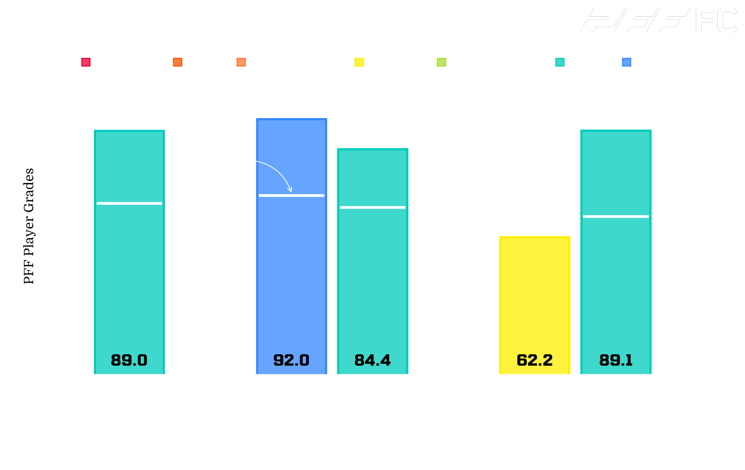 His PFF FC Grades have been exceptional. A 97.6 Passing grade is good enough for 2nd best in the league and is the highest for any centre-midfielder. His 104 completed line-breaking passes and 24 chances created are big contributors to this grade. We also have him rated as the best centre-midfielder at crossing so far this season and his dominance in the middle of the park is reiterated with a 86.8 tackle resistance grade, 2nd only to Liverpool’s Ryan Gravenberch (90.4).